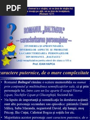 Astfel, tema operei ilustrează lumea arhaică a satului românesc, viața păstorilor, care păstrează tradițiile și valorile … 23.08.2011 · personajele din baltagul sunt umatoarele : Vitoria lipan este personajul principal al operei, fiind unul dintre cele mai reprezentative modele din literatura română. Aceasta reprezintă tipul femeii de la munte, o fire energică și harnică, caracterizată de o inteligență nativă și care intuiește foarte bine ….. Personajele romanului baltagul de mihail sadoveanu sunt numeroase și bine individualizate, destinul lor fiind construit în funcție de trăsăturile de caracter.