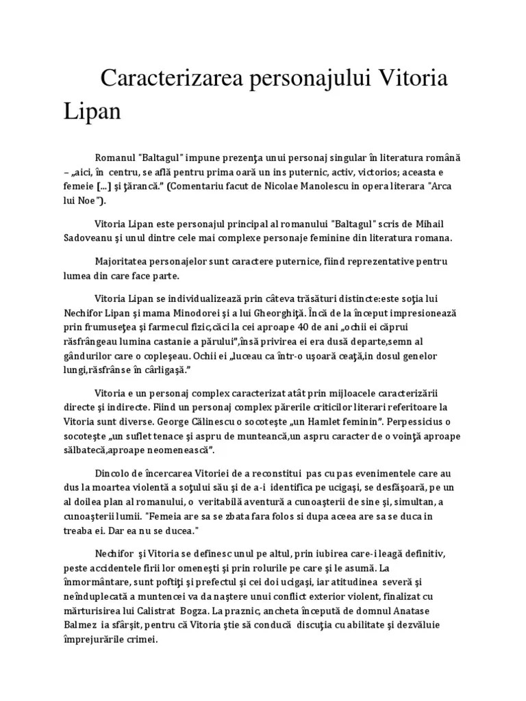 Nu mai este tanara dar are o frumusete neobisnuita in privire. Nechifor lipan, vitoria lipan (sotia lui nechifor lipan), minodora si gheorghita lipan (fii celor 2 adica a lui vitoria si nechifor lipan), baciul alexa, argatul mitrea, mos pricop, ciobanul david (cel care o ajuta pe vitoria cu banii de drum), prefectul anastase bolmez si cei 3 hangii : Autorul a dorit să prezinte în acest roman viața oamenilor de la munte și caracterul acestora. Cucereste prin frumuseatea si farmecul ei fizic; Caracterizarea personajelor din romanul baltagul: Personajele romanului baltagul de mihail sadoveanu sunt numeroase și bine individualizate, destinul lor fiind construit în funcție de trăsăturile de caracter. Vitoaria lipan devine un tip reprezentativ dar care se individualizeaza prin unele trasaturi specifice; Vitoria lipan este personajul principal al operei, fiind unul dintre cele mai reprezentative modele din literatura română. Nu mai este tanara dar are o frumusete neobisnuita in privire.
