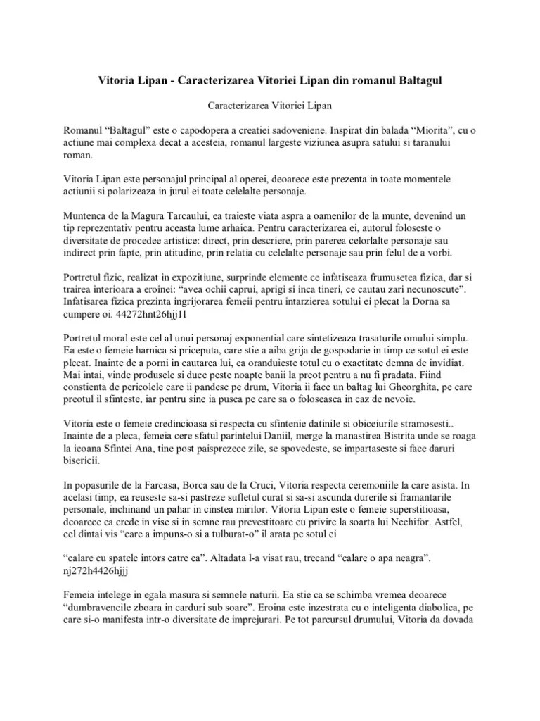Vitoaria lipan devine un tip reprezentativ dar care se individualizeaza prin unele trasaturi specifice;. 23.08.2011 · personajele din baltagul sunt umatoarele : Cucereste prin frumuseatea si farmecul ei fizic; Are ochii caprii, cu gene lungi, rasfrante in carligase, par castaniu; Cucereste prin frumuseatea si farmecul ei fizic;