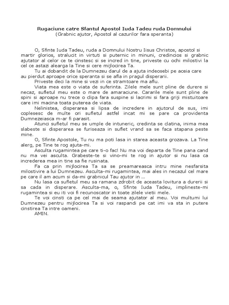 Scris de maria | aprilie 17, 2016, 7:52 pm Fie ca veti folosi aceste rugaciuni, fie ca va veti ruga folosind cuvintele dumneavoastra, cel mai important e sa va rugati din suflet si sa aveti incredere ca sf apostol iuda tadeu o sa va ajute. O, sfinte iuda tadeu, ruda a domnului nostru iisus hristos, apostol și martir glorios, strălucit în virtuți și puternic în minuni, credincios și grabnic ajutător al celor ce te. Si sa nu uitati ca atunci \\\\\\\ cand ne rugam se indeplineste intotdeauna ceea ce avem in suflet, si nu ceea ce avem doar pe buze. Scris de maria | aprilie 17, 2016, 7:52 pm. Fie ca veti folosi aceste rugaciuni, fie ca va veti ruga folosind cuvintele dumneavoastra, cel mai important e sa va rugati din suflet si sa aveti incredere ca sf apostol iuda tadeu o sa va ajute.