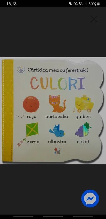 Cartea are 12 de pagini și se încadrează în categoria carte prescolara, joc... Culori a fost scrisă de * * * și a apărut în anul 2019 la editura litera. Cartea are 12 de pagini și se încadrează în categoria carte prescolara, joc. Cartea carticica mea cu ferestruici. Cartea carticica mea cu ferestruici.. Cartea carticica mea cu ferestruici.