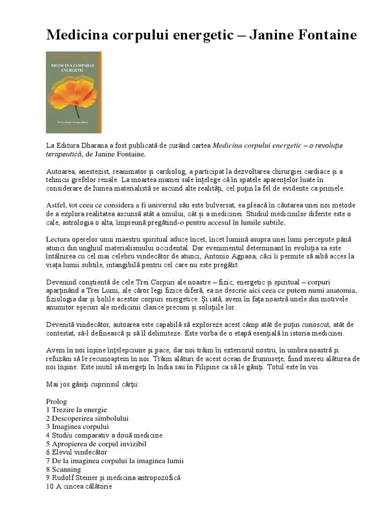 Ea se bazeaza pe conceptul de "energie'" in timp ce medicina obisnuita se bazeaza, in cea mai mare parte, pe conceptul de "materie", prin folosirea medicamentelor... . Daca sunteti la prima achizitie de carti in format electronic recomandam accesarea paginilor tutorial aflate in paginile produselor ebook (despre ebook, tutorial instalare, tutorial transfer, compatibilitate) in care se regasesc informatii foarte importante despre modul de accesare al acestor carti.